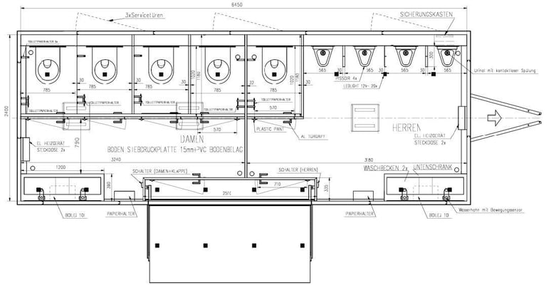 Toilettenanhänger mit 4 x Damen WC, 1 x Herren WC und 4 x Urinal